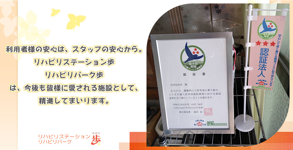 スタッフの働きやすい環境、生涯学習への取り組み、地域貢献等で尽力している施設が認証を受けられる制度です。 今回、三ツ星の最高ランクでの認証を頂きました。今後、認証に恥じない様にスタッフ共々精進してまいります。
